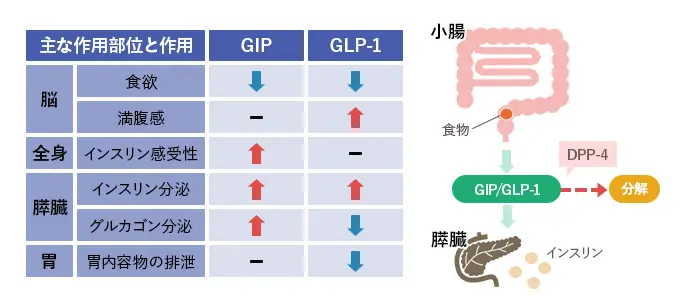 マンジャロは、「GIP(グルコース依存性インスリン分泌刺激ポリペプチド)」と「GLP-1(グルカゴン様ペプチド-1)」の両インクレチンの作用をひとつに統合した国内初のGIP/GLP-1受容体作動薬です。